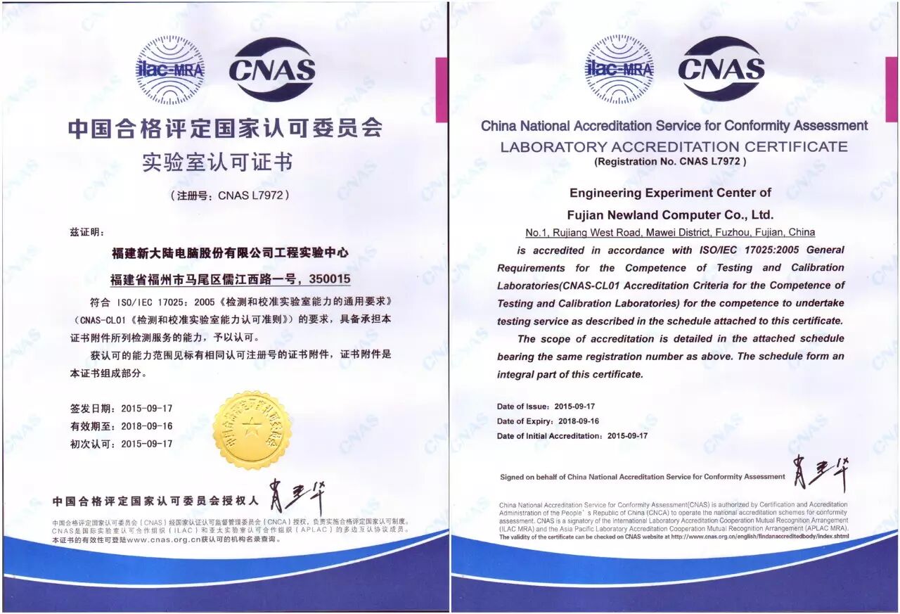 2015年10月,新大陆工程实验中心获CNAS国家实验室资质