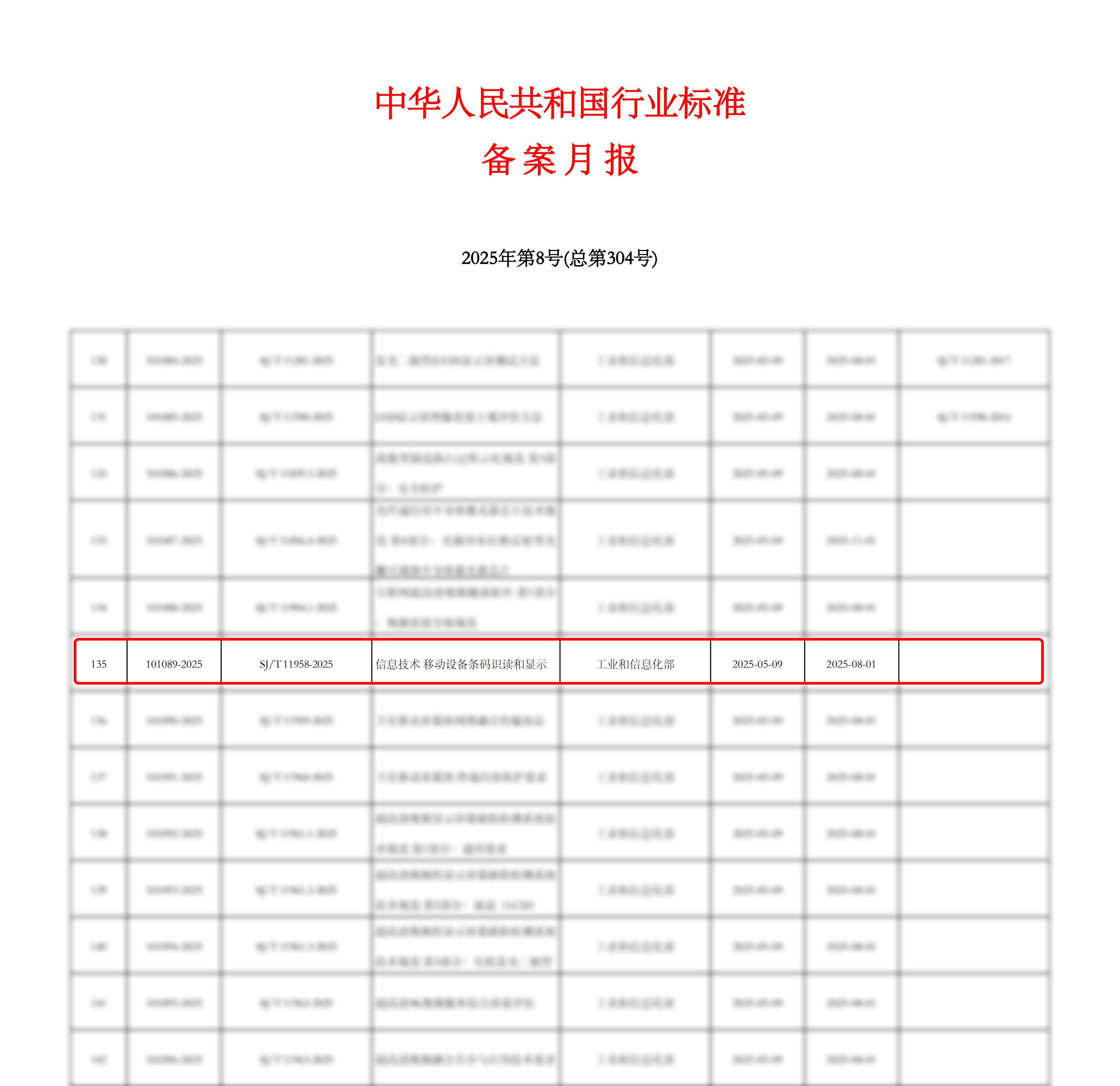 近日,工业和信息化部发布的行业标准《信息技术 移动设备条码识读和显示》(标准号:SJ/T 11958-2025)已正式实施,成功填补了国内移动设备条码识读标准的空白。该标准由新大陆数字技术股份有限公司主持,中国电子技术标准化研究院、福建省产品质量检验研究院、蚂蚁科技集团股份有限公司、福建新大陆自动识别技术有限公司等9家单位共同参与制定。其中,蔡春水、李霖、郭锋等新大陆专家作为主要起草人,深度参与了标准关键技术条款的论证与制定。